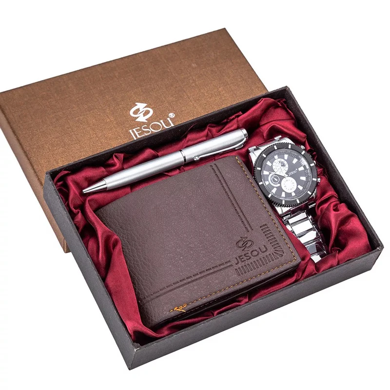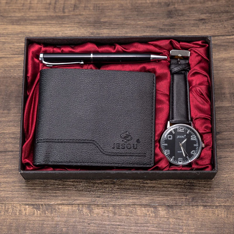 Good Product Men Watches Set Steel/Learther Quartz Wrist Watch Folding Wallet Ballpoint pen Gift Set for Boyfrie